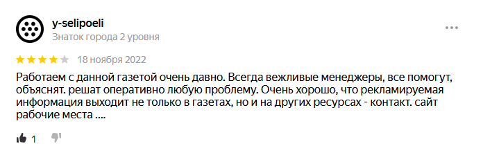 Сказать что-то негативное в отношении газеты «Рабочие места» просто невозможно. Отзывчивые менеджеры, действительно работающее издание! А что еще необходимо для длительного и полноценного сотрудничества?