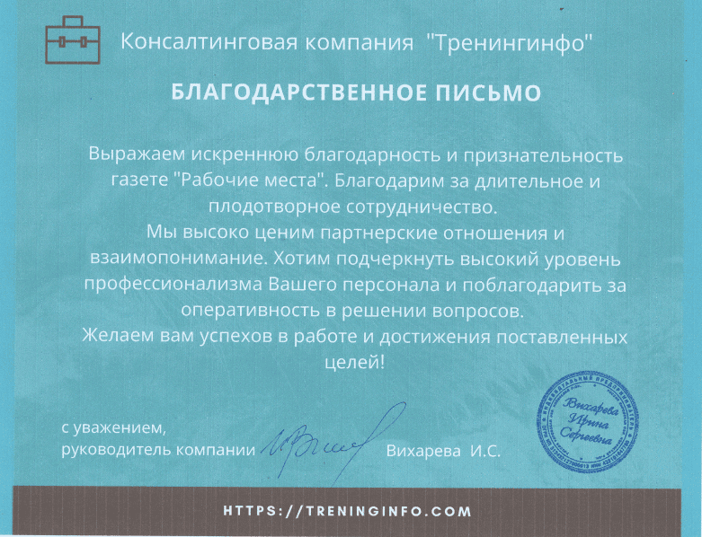 Хотим выразить искреннюю благодарность изданию газеты "Рабочие места" за высокий уровень сервиса и надлежащее качество работы, а также поставить высокую оценку менеджеру Ефремовой Надежде за профессиональный подход, консультации и решение спорных вопросов по размещению рекламы на Ваших страницах. Всегда активная, веселая и доброжелательная, приятно работать.