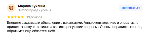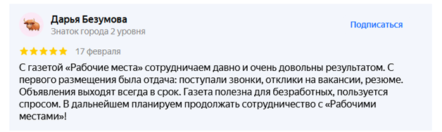 Сотрудничество с газетой "Рабочие места" началось с совета знакомой - вакансий много, работодатели реальные. Разместилась. Объявление отработало на 100%. В дальнейшем из интереса сравнивала с другими подобными компаниями, но в конечном итоге "Рабочие места" доказали свою результативность. Сегодня являемся неизменными партнерами. Приятно иметь дело с профессиональной компанией.