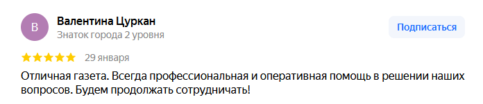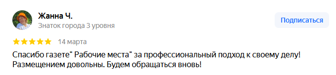 С газетой «Рабочие места» я сотрудничаю практически с момента ее образования. Наше предприятие постоянно расширяется, поэтому у нас часто возникает необходимость в сотрудниках. Благодаря газете «Рабочие места» мы успешно пополняем штат в течение всего периода сотрудничества. Радует, что издание очень доступное с точки зрения стоимости рекламы. Менеджеры газеты оперативно реагируют на все пожелания, всегда внимательны, лояльны, своевременно предоставляют интересующую информацию. Хотелось бы пожелать газете «Рабочие места» и ее сотрудникам дальнейшего процветания, расширения круга своих читателей и заказчиков. Надеемся, что наше сотрудничество будет долгим и взаимовыгодным!