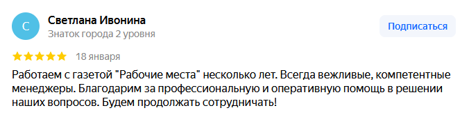 С газетой «Рабочие места» я сотрудничаю практически с момента ее образования. Наше предприятие постоянно расширяется, поэтому у нас часто возникает необходимость в сотрудниках. Благодаря газете «Рабочие места» мы успешно пополняем штат в течение всего периода сотрудничества. Радует, что издание очень доступное с точки зрения стоимости рекламы. Менеджеры газеты оперативно реагируют на все пожелания, всегда внимательны, лояльны, своевременно предоставляют интересующую информацию. Хотелось бы пожелать газете «Рабочие места» и ее сотрудникам дальнейшего процветания, расширения круга своих читателей и заказчиков. Надеемся, что наше сотрудничество будет долгим и взаимовыгодным!