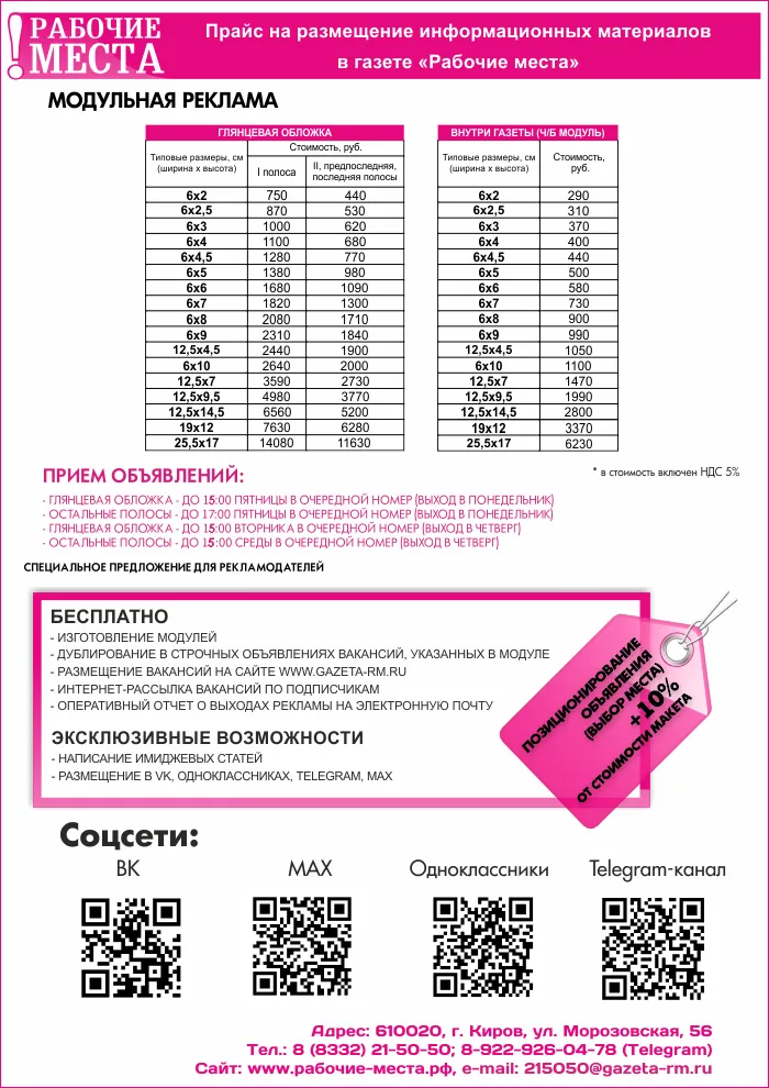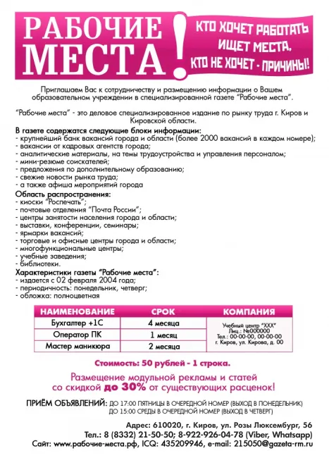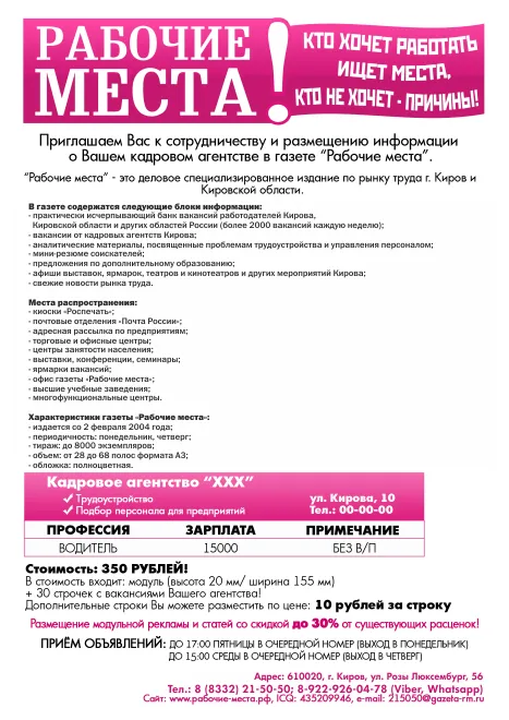 При подаче объявления в газету «Рабочие места» ваша информация одновременно будет: